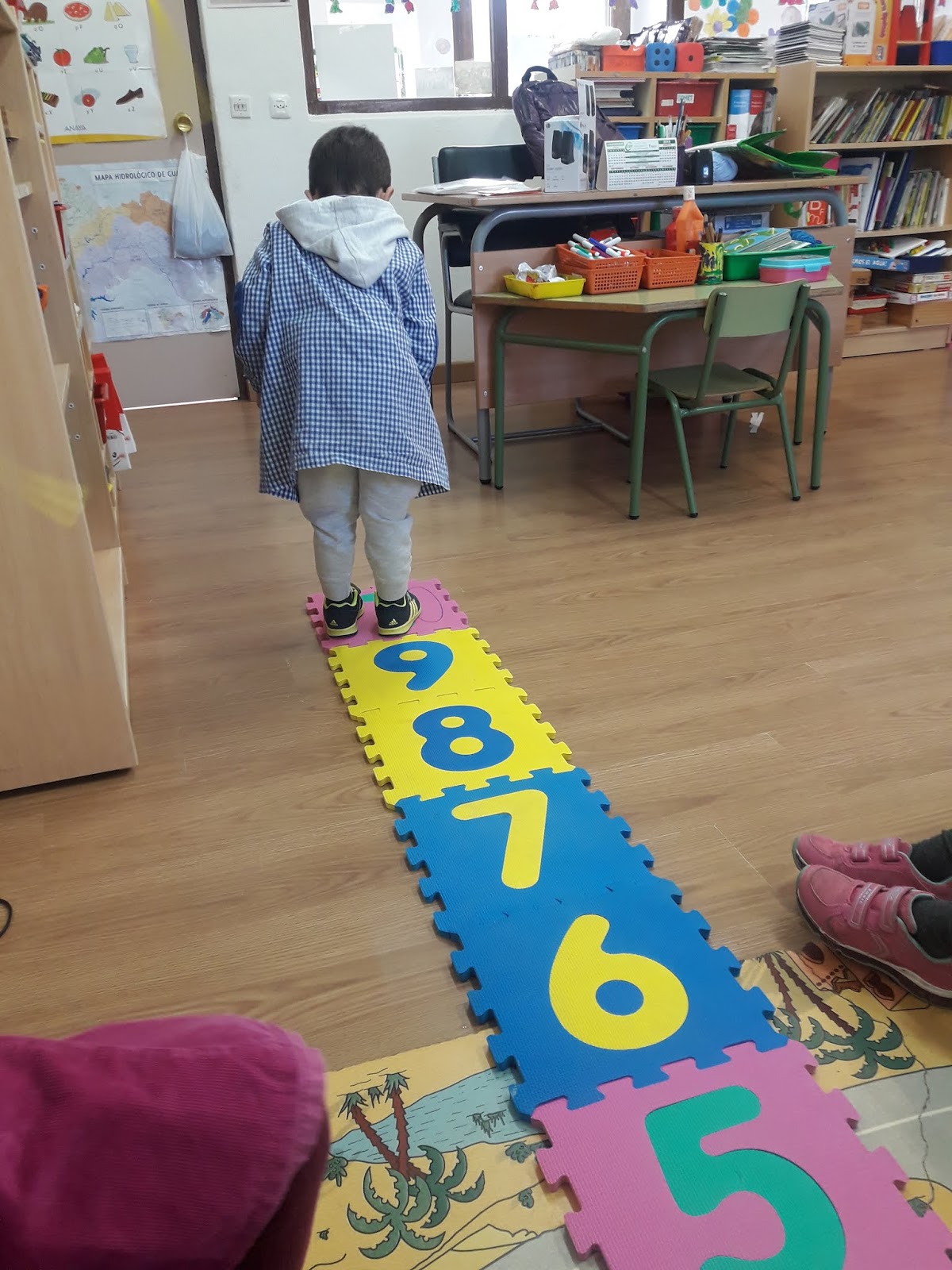 Ahora en este nivel el niño ya puede contar desde cualquier número que se le pide, por ejemplo se le puede decir que se sitúe en el número 3 de la alfombra y que cuente desde ahí hasta el número 10. Además aquí ya podemos iniciar la retrocuenta, es decir, contar hacia atrás.